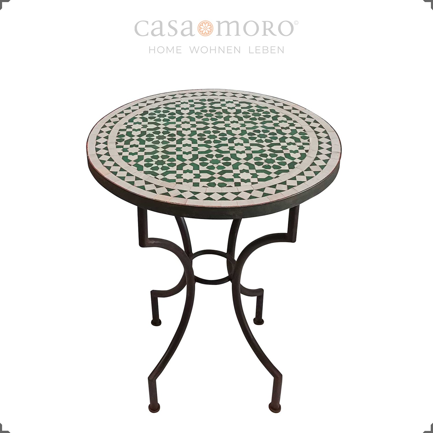 Dieser kunstvoll gefertigte Bistrotisch bringt marokkanische Handwerkskunst auf Deine Terrasse oder in Deinen Garten. Das lebendige Zellige-Mosaik in Grün und Weiß setzt starke Akzente – für genussvolle Augenblicke zu zweit.