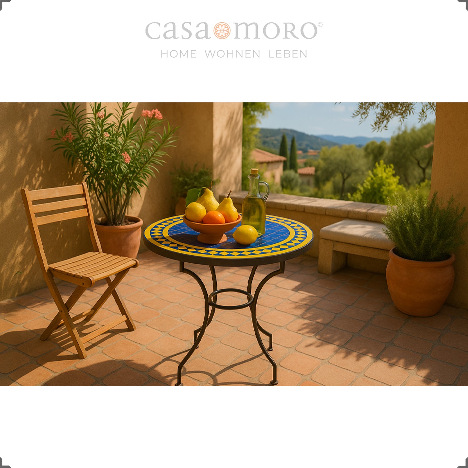 Die Mosaikplatte (ca. 18 kg) wird in Marokko handgefertigt und liegt stabil, aber ohne Verschraubung auf dem geschwungenen Metallgestell. So lässt sich der Tisch flexibel umstellen – ob im Wohnzimmer, auf der Terrasse oder als farbiger Akzent in der Küche.