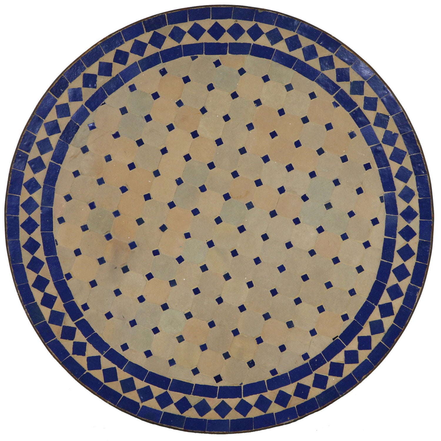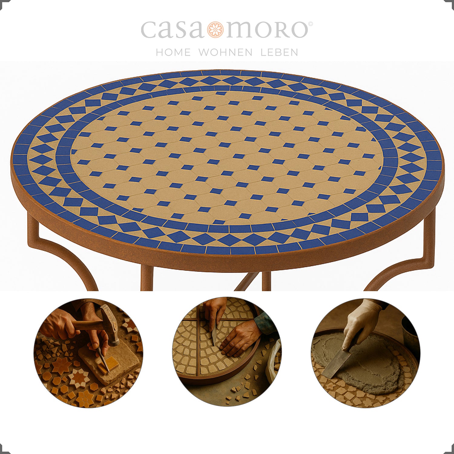 Ein runder Gartentisch in 100cm Durchmesser, der mit seinem mediterranen Zellige-Mosaik in Blau-Terracotta zum stilvollen Akzent auf Terrasse, Balkon oder im Wohnzimmer wird – handgefertigter, marokkanischer Mosaiktisch.