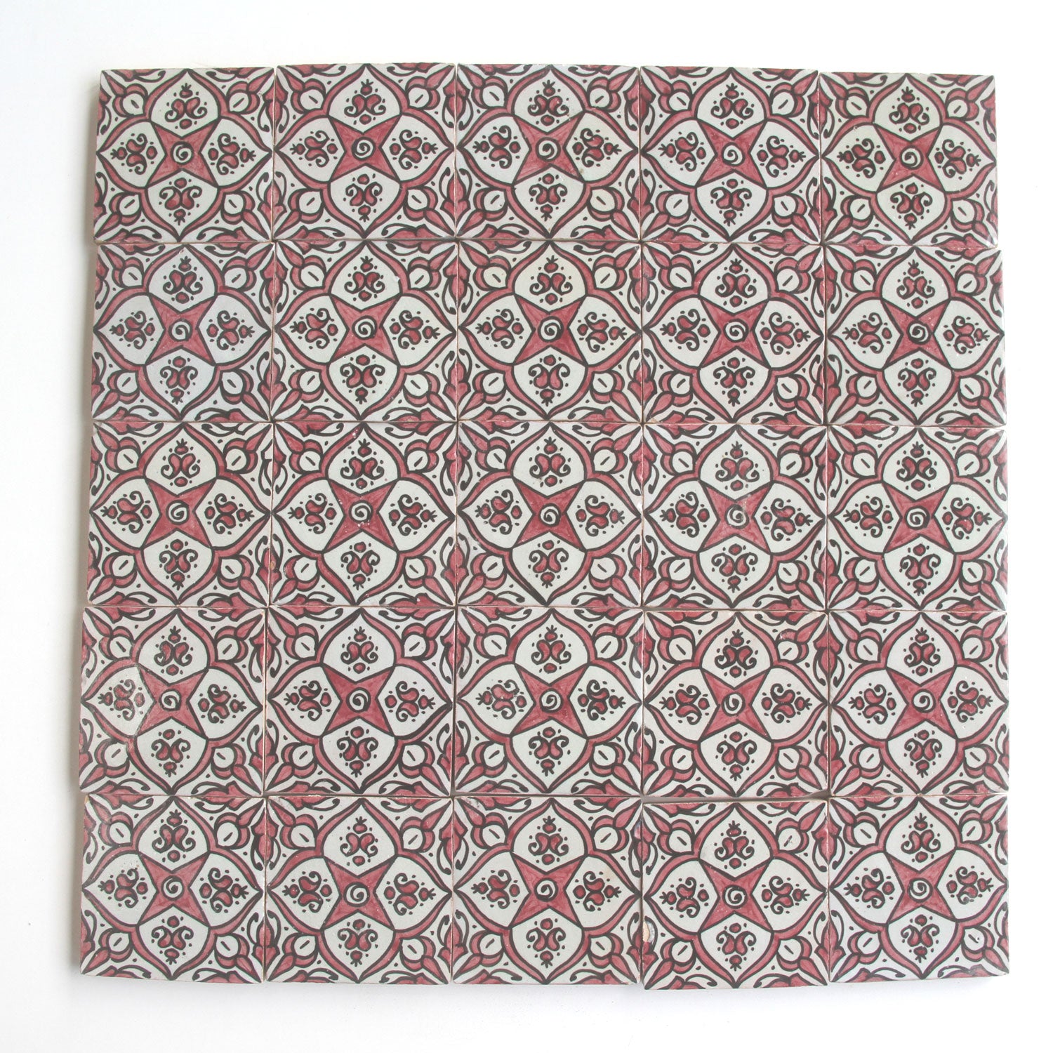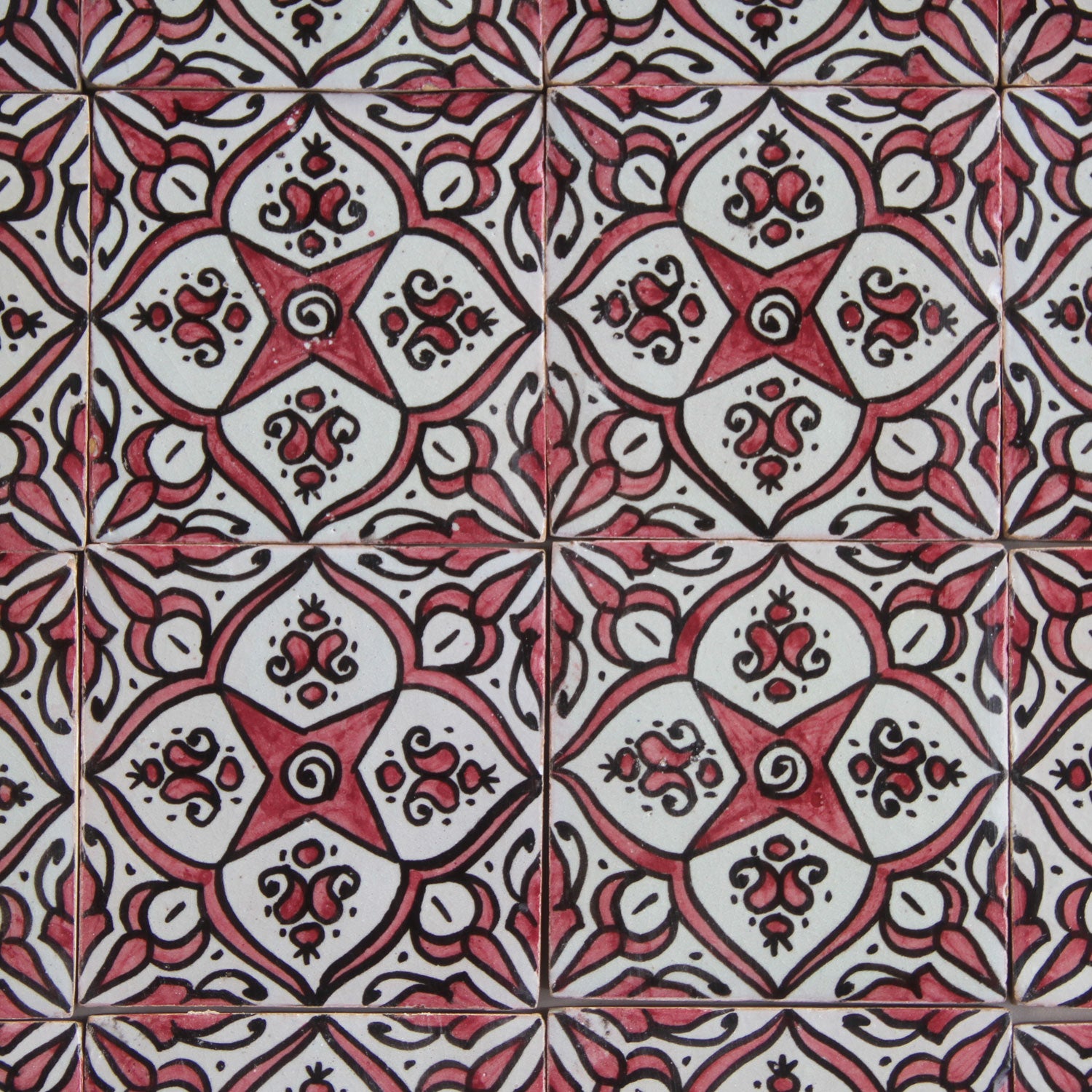 Das Motiv dieser handbemalten Keramikfliese zeigt ein klassisches Sternmuster, das von floralen Ornamenten umgeben ist. Solche maurischen Muster sind typisch für den andalusischen Stil und erinnern an historische Paläste und Innenhöfe in Spanien und Marokko. Die kräftigen Rot-, Weiß- und Schwarztöne erzeugen dabei einen besonders ausdrucksstarken Kontrast.