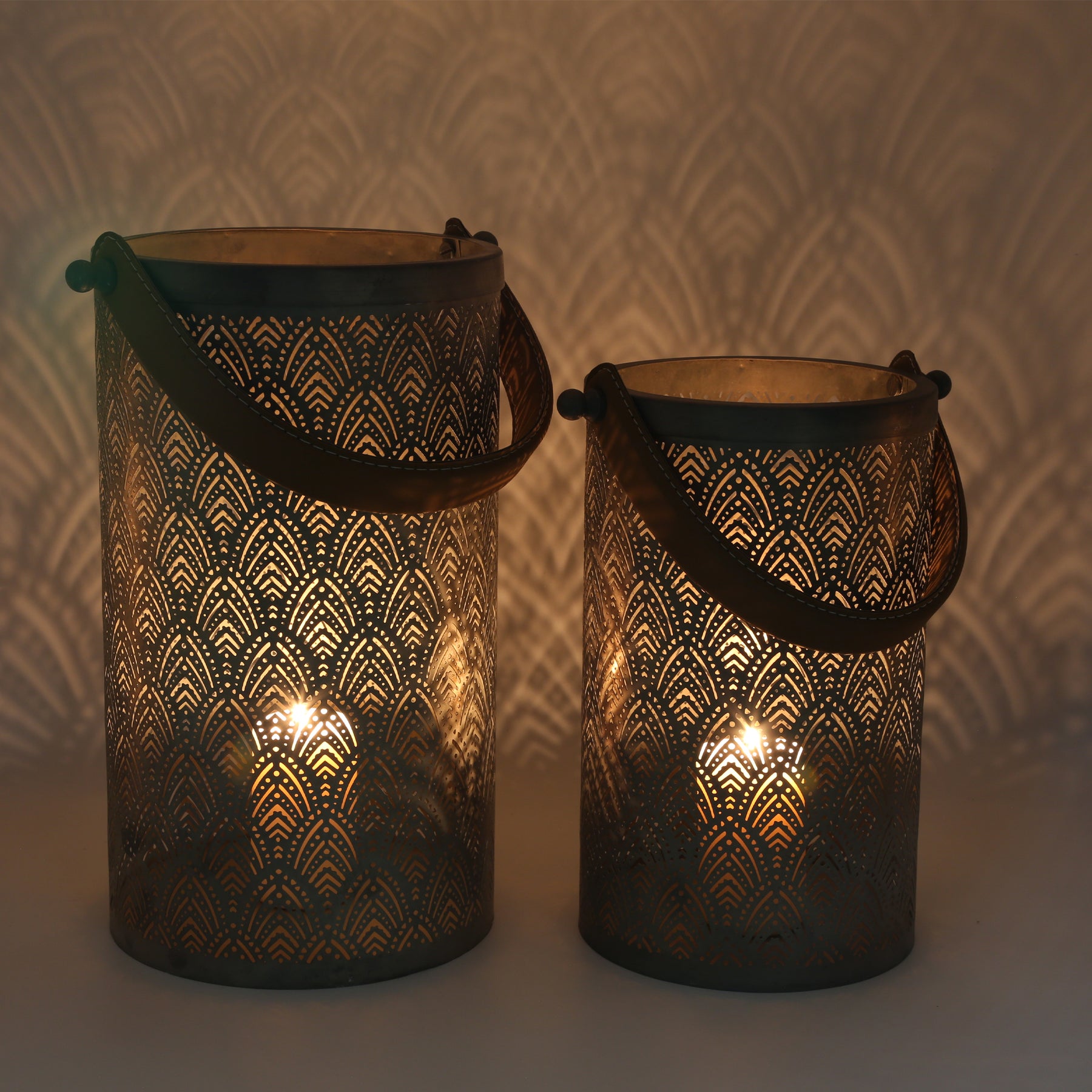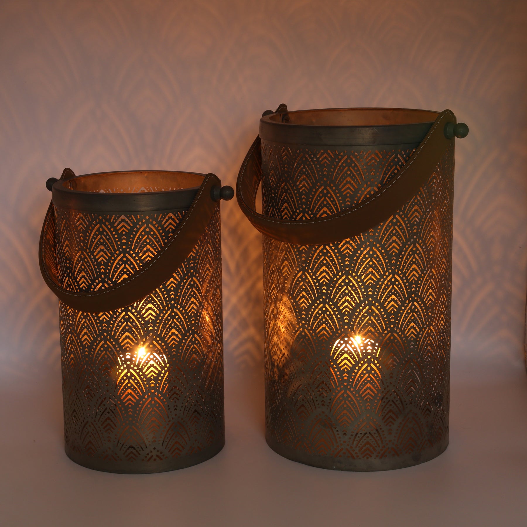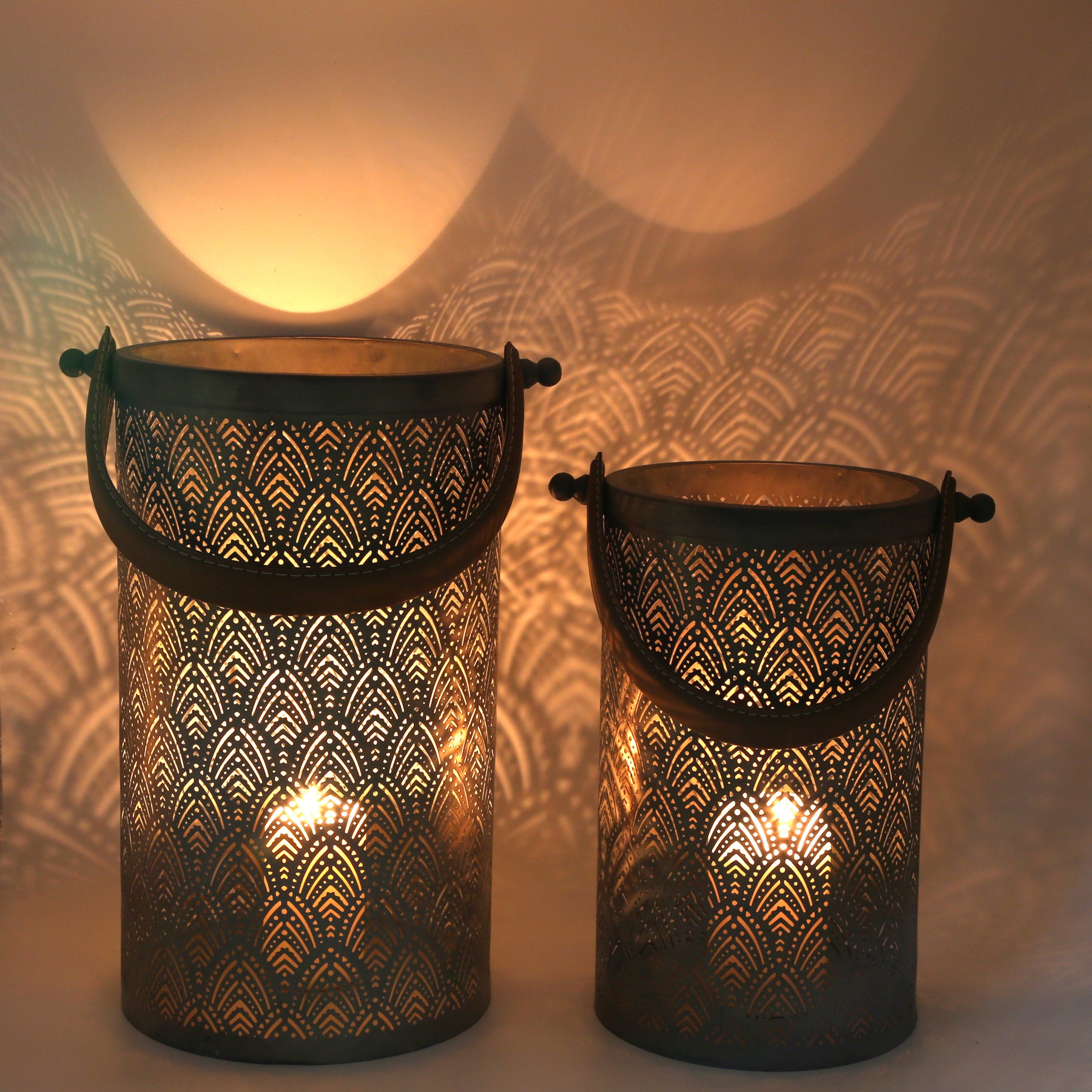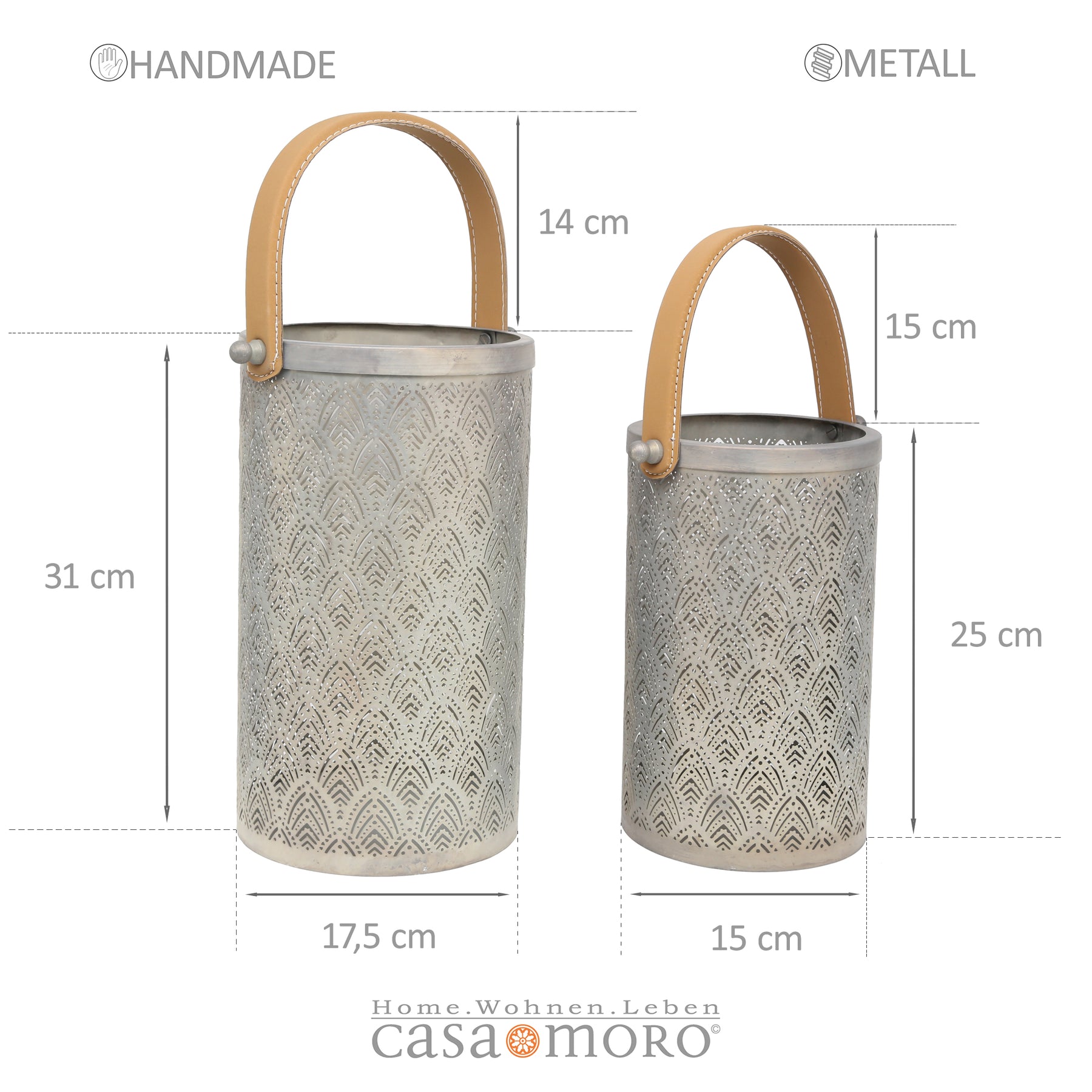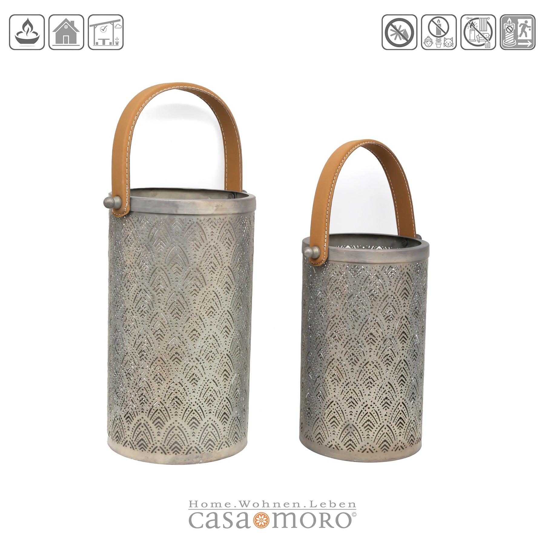 Die silberne Metalloberfläche mit fein gearbeiteten Ornamenten harmoniert perfekt mit modernen und Industrial-Einrichtungsstilen. Die robusten Kunstlederhenkel unterstreichen die Verbindung von Funktionalität und Stil, während sie das Tragen der Laternen angenehm machen – ideal für den Einsatz im Wohnzimmer, auf dem Sideboard oder als Bodenlaterne. Ihre vielseitige Nutzungsmöglichkeit macht sie zum dekorativen Allrounder.