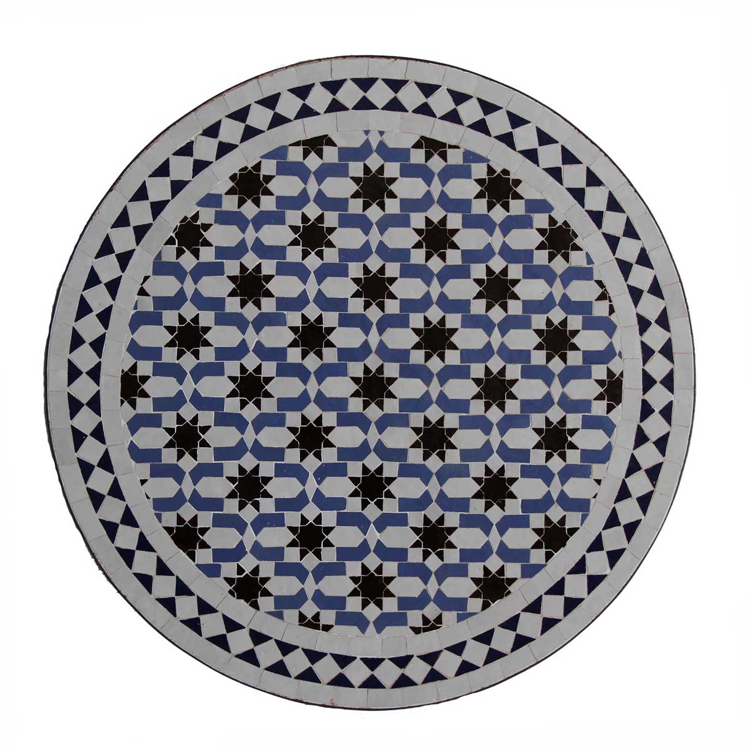 Bei diesem Mosaiktisch sind gleich zwei Sternenformen kombiniert: Bei genauem Hinsehen erkennen Sie die Entwicklung des Achtersterns (mit spitzen Zacken) aus dem Achtortstern (mit rechteckigen Zacken). Blaue, wie Bänder geformte Tesserae (Mosaikstücke) rahmen jeden Stern ein. Die weißen Fliesenstücke wirken dabei wie ein Untergrund. Doch weit gefehlt: Auch sie sind Teil dieses vollständig glasierten Zellige-Mosaiks. Dank seiner kühlen Ausstrahlung fügt sich dieser Bistrotisch perfekt in eine modern gestaltete Umgebung ein. Mit einem Eisenstuhl erhält er die gewünschte Authentizität.