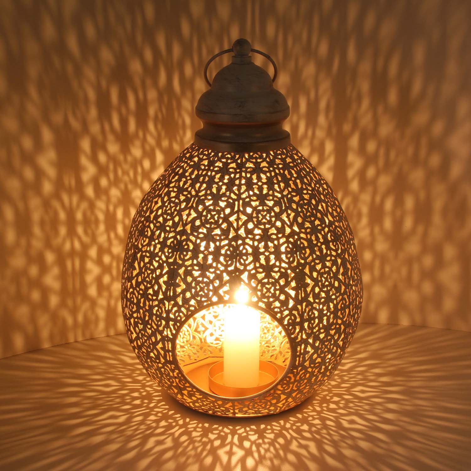 Der Kerzenhalter ist von innen in gold und außen in Shabby Chic weiss-gold lackiert. Im inneren befindet eine eingebaute Tasse für eine Kerze oder Teelicht. Ob auf der Terrasse, im Haus oder im Garten, diese Laterne schafft eine sehr schönes orientalisches Tisch-Ambiente.