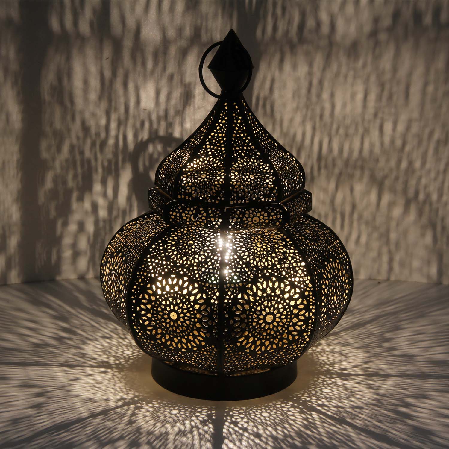 Unsere Tischlampe Asif ist eine wunderschöne orientalische Lampe, welche sorgsam von Hand gefertigt wurde! Ihre traumhaften Muster und Schattenspiele verzaubern jeden Raum. Die Bodenlampe ist in von innen in Antik-Gold-Look und außen ist diese in schwarz lackiert.