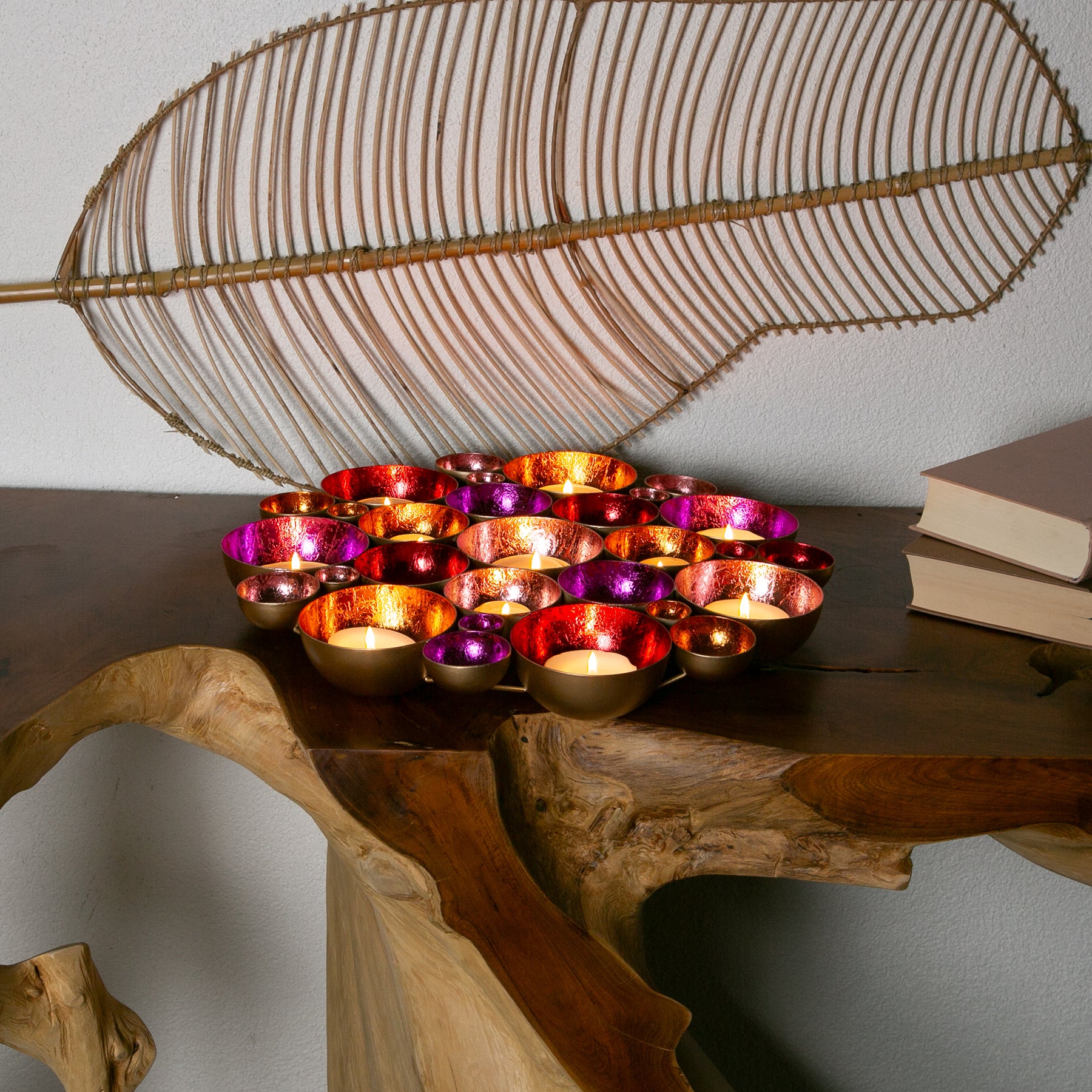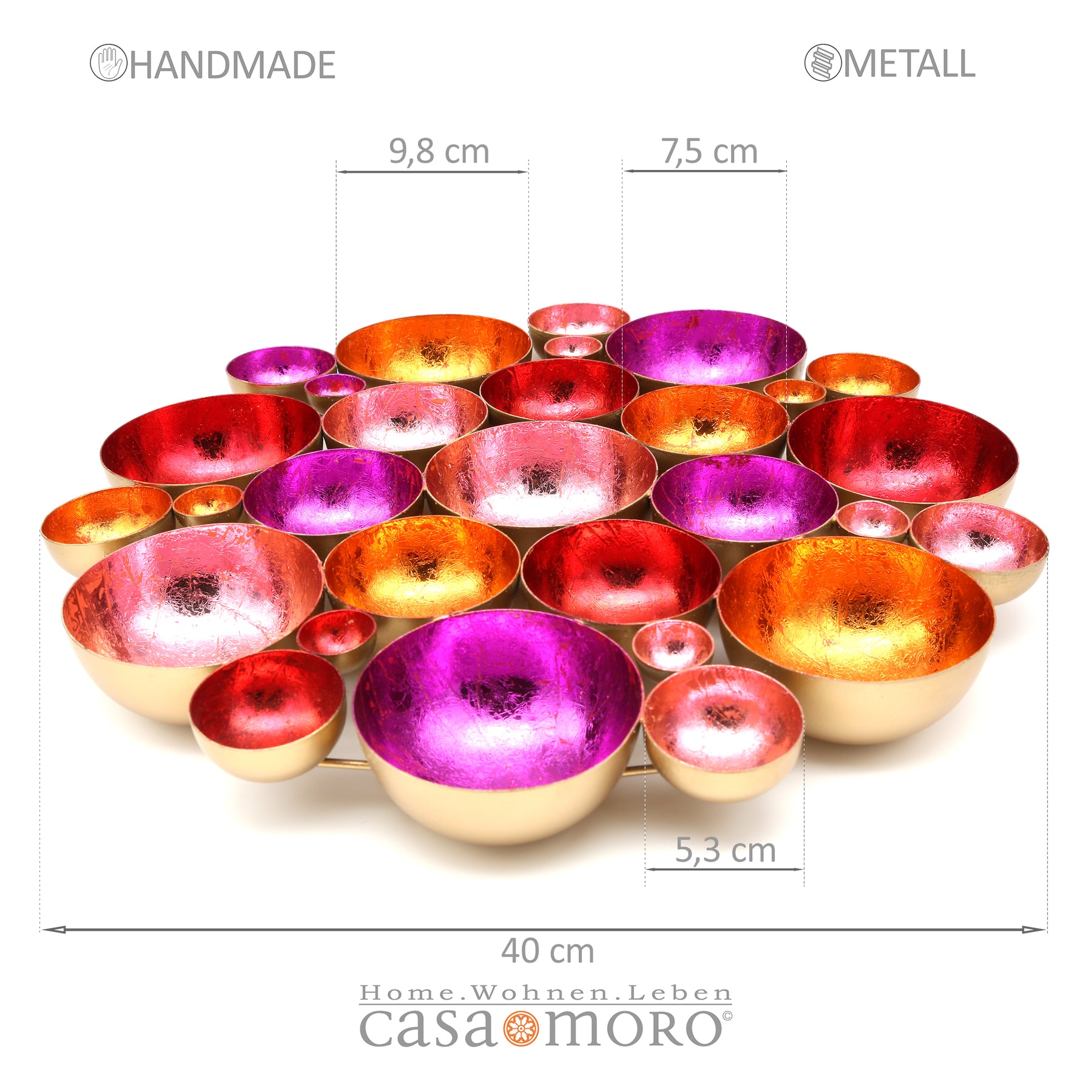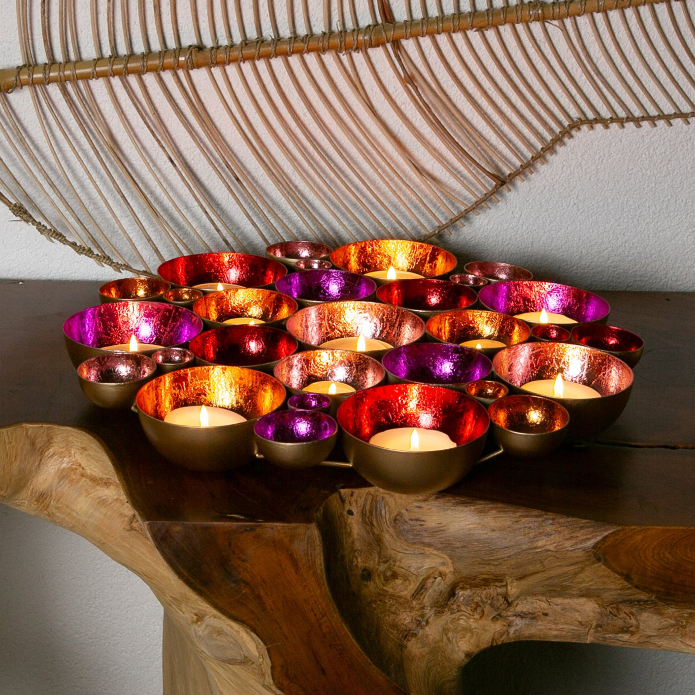 Blütenmeer aus Licht – Die handgefertigten Schalen in leuchtenden Farben sind zu einer wunderschönen Blume zusammengefügt und bringen eine einzigartige Lichtstimmung in dein Zuhause. Diese Dekoschale vereint kunstvolle Handarbeit und glamouröse Eleganz: Aus Metall gefertigt und innen in lebendigen Farben wie Gold, Rot, Pink, Rosa und Orange veredelt, reflektiert sie das Licht auf faszinierende Weise und schafft eine warme, einladende Atmosphäre.
